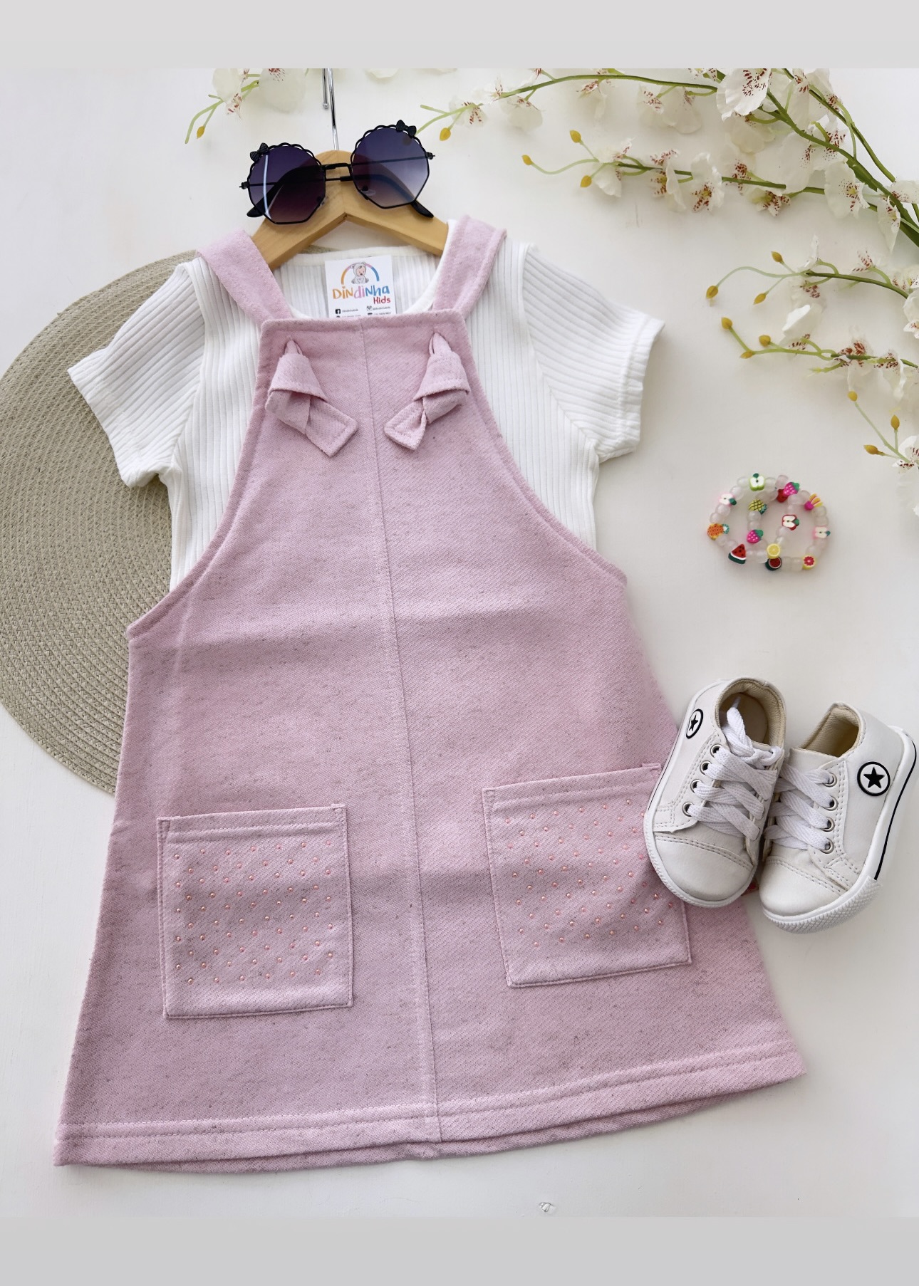 Lindo conjunto infantil composto por blusa em ribana de manga curta, super macia e confortável, e uma charmosa salopete em moletinho sem flanela, que garante leveza e praticidade para o dia a dia. A peça conta com bolsos frontais funcionais e delicados detalhes em strass, que trazem um toque especial de brilho e sofisticação ao look. Um conjunto de alta qualidade, versátil e moderno, perfeito para deixar sua menina ainda mais estilosa em qualquer ocasião.