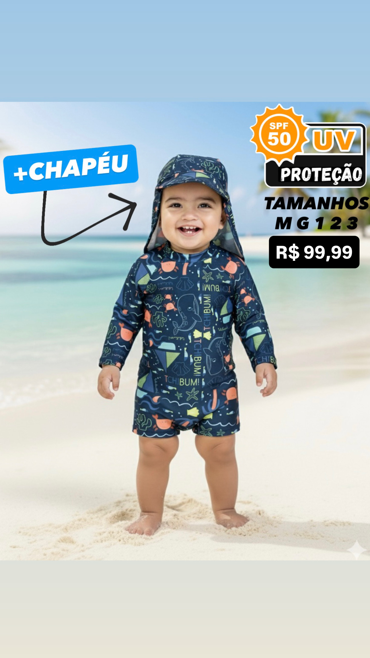 Porque brincar ao sol pode (e deve!) ser seguro. Com esse conjunto, seu filho fica protegido da cabeça aos pés, sem abrir mão do conforto. E o melhor: com praticidade na hora de vestir e trocar!