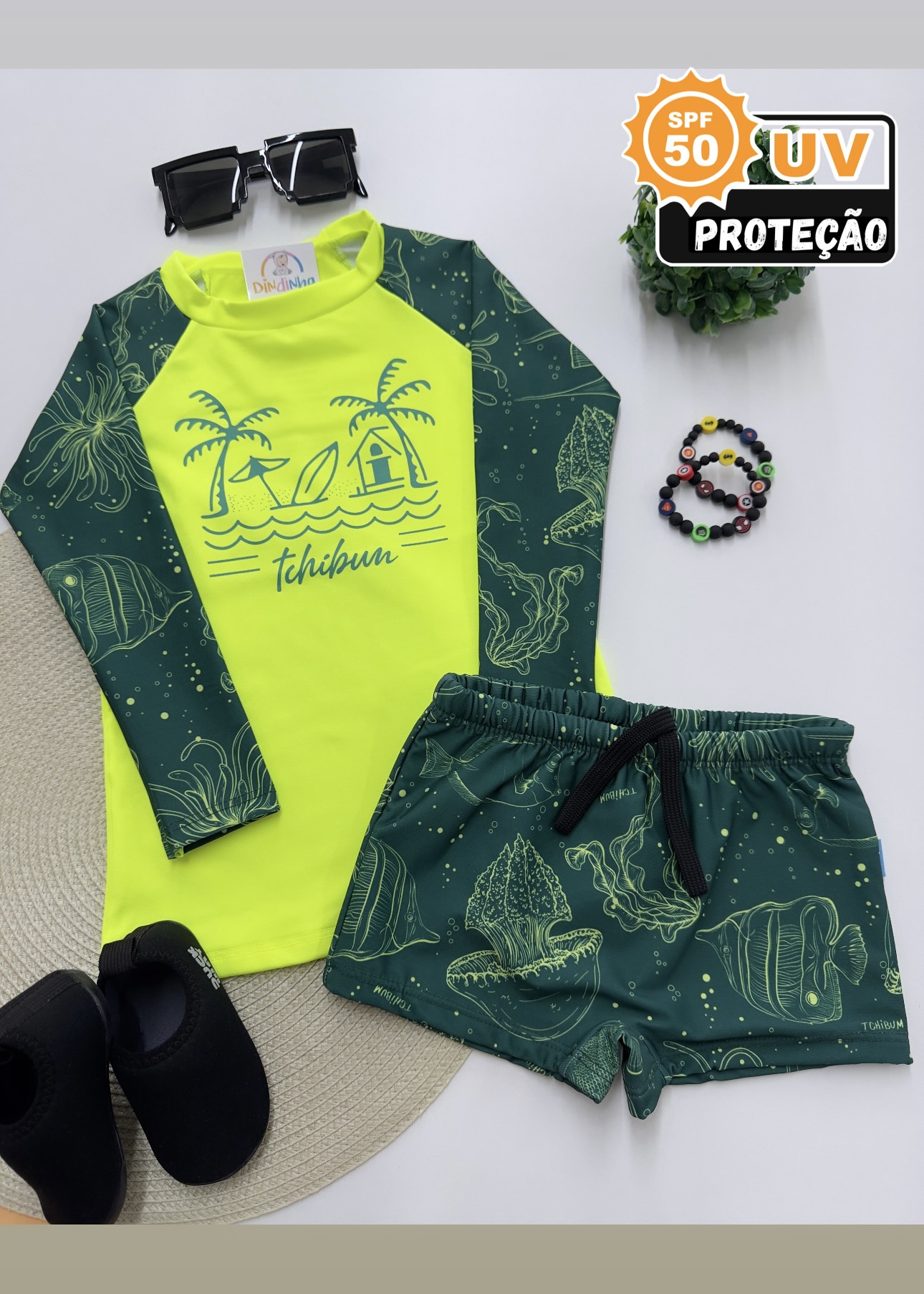 A camiseta de manga longa protege os braços e o tronco contra os raios solares, enquanto a sunga boxer forrada oferece segurança e ótimo ajuste ao corpo. 🩱👕
