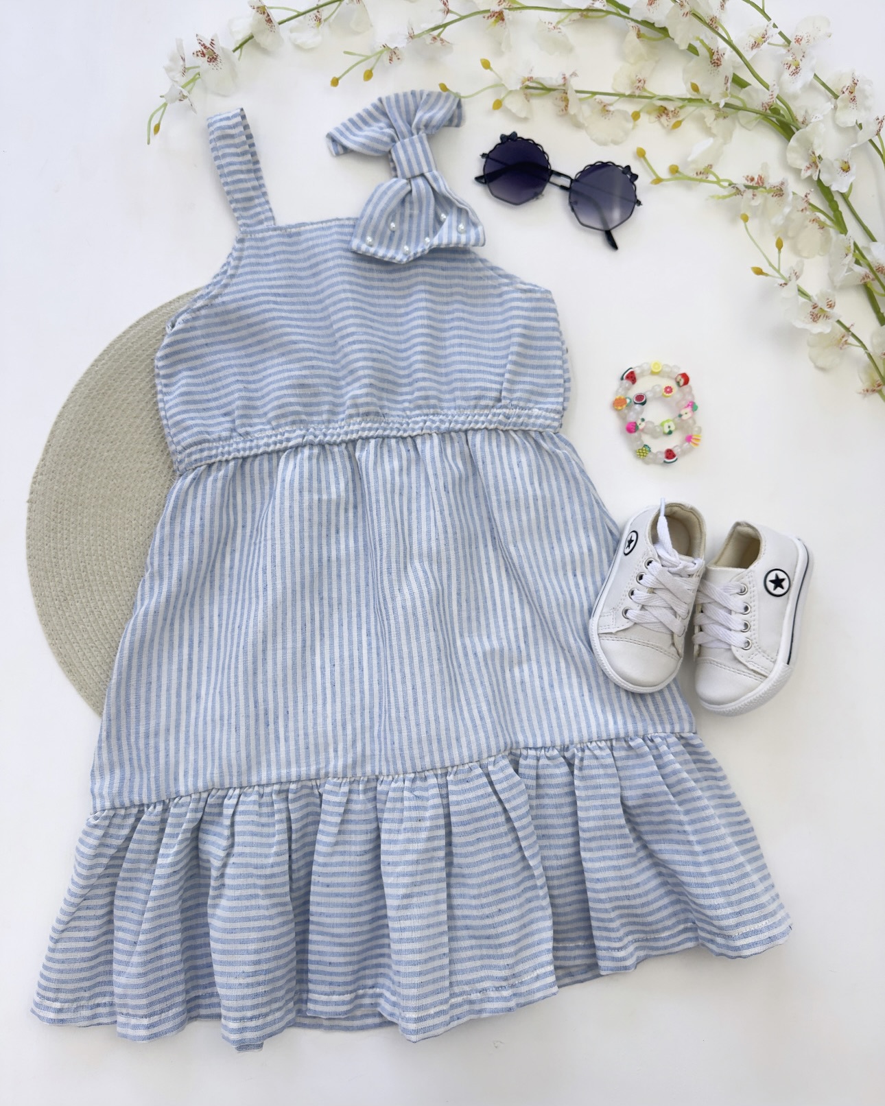 Encantador vestido infantil confeccionado com material reciclado, unindo sustentabilidade, beleza e qualidade em uma só peça. Seu design listrado traz um visual moderno e alegre, enquanto o forro interno garante maior conforto e caimento perfeito. As delicadas pérolas aplicadas na alça dão um toque de charme e sofisticação, tornando o vestido ainda mais especial. Uma peça muito bonita, confortável e de alta qualidade, pensada para que as crianças aproveitem cada momento com estilo e bem-estar.